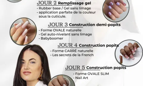 - Formations professionnelles en manucure russe, stylisme ongulaire et perfectionnement technique.